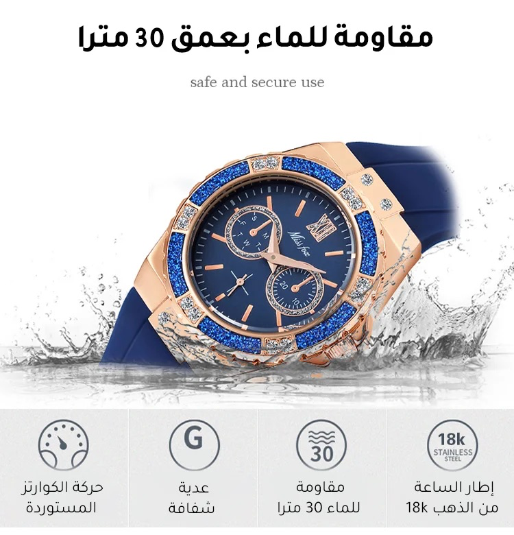 ساعات MISSFOX هي ساعات كوارتز نسائية تتميز بتصميم كرونوغرافي، وتأتي بميناء كوارتز وحركة الساعة. كما يبدو أنها مطلية بالذهب ومزينة بأحجار الماس، مما يضفي عليها لمسة من الفخامة والأناقة.