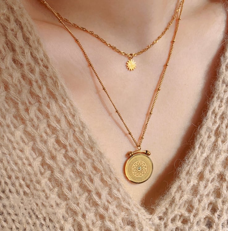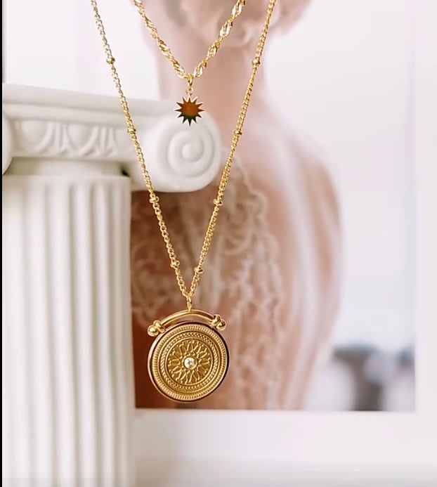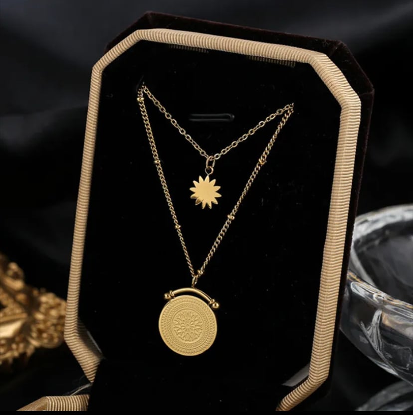 قلادة الشمس الخالدة، التي تُعرف أيضًا بـ "بلورة الحب"، هي قطعة مجوهرات فريدة من نوعها تم تصميمها بشكل يجمع بين الجمال والأناقة والروح العصرية. تتكون القلادة من عدة طبقات متداخلة، ما يمنحها مظهرًا متعدد الأبعاد وجذابًا.